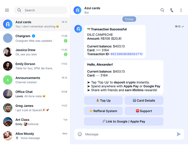Most modern cards require you to install a mobile app or at least a Telegram mini app. Unlike those, our Telegram bot does not collect any personal data — it has no access to your IP address, device information, phone number, or email.
